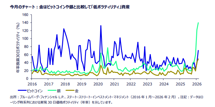 これらを総合すると、金はポートフォリオにおける左側のテールリスクに対するヘッジ手段として捉えることができるでしょう。ビットコインや銀にもフィアット通貨のオルタナティブ資産としての特性は一部ありますが、当社はこれら2つの資産は、右側テールリスクを有する高ボラティリティの資産と見ています。実際、2026年にオルタナティブ・フィアット通貨市場全体でボラティリティが急上昇した局面でも、金は他のフィアット通貨のオルタナティブ資産よりも価格変動が小さく安定していました。