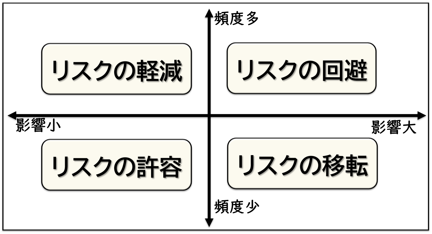 頻度は多いが、影響は小さい場合は何らかの「リスク低減」策を講じます。最後に頻度も少ないし損害額も小さなリスクは無視します。「リスク許容」、受け入れるということです。風邪を引いたり、ケガをしたりすることにいちいち対策など不要という意味です。