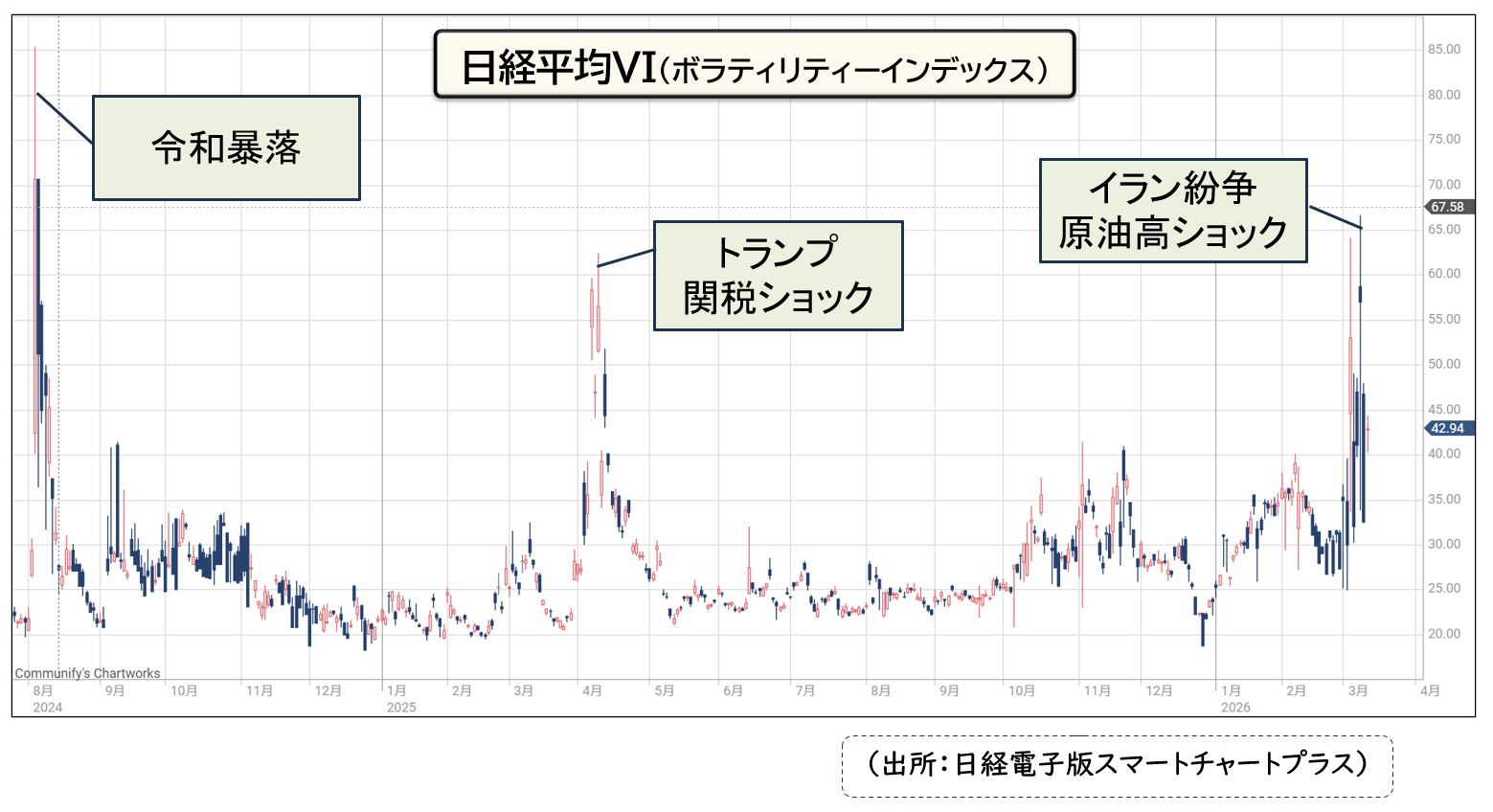 このグラフが急激に上昇する局面こそがテールリスクの発生時です。この数年を振り返るだけで毎年、定期的にテールリスクが起こっていることがわかりますね。グラフをみる限り、今回のイラン紛争による原油高ショックは、昨年のトランプ関税の衝撃を超えていることがうかがえます。
