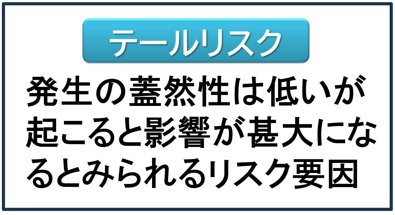 滅多に起こらないけど起こったら甚大な影響を及ぼすリスクをテールリスクといいます。テールはしっぽ。動物の本体部分と比べてテールはわずかなので、蓋然性が低いという意味を込めています。代表的なテールリスクに先ほど挙げた戦争勃発や震災・天災などが該当します。