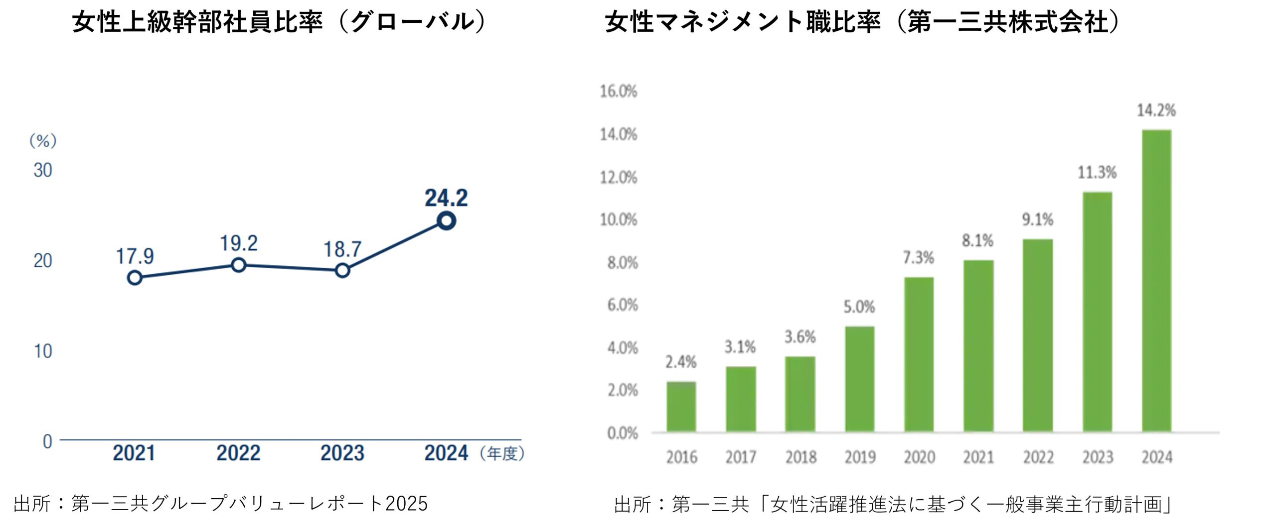 女性人材の取締役登用が継続するために、第一三共では将来の取締役候補となる女性管理職の育成にも注力しています。マテリアリティKPIとしてグローバルに女性上級幹部社員比率を設定し(2025年度目標30%)、それに紐づけて国内で女性管理職比率を設定し、モニタリングしています。