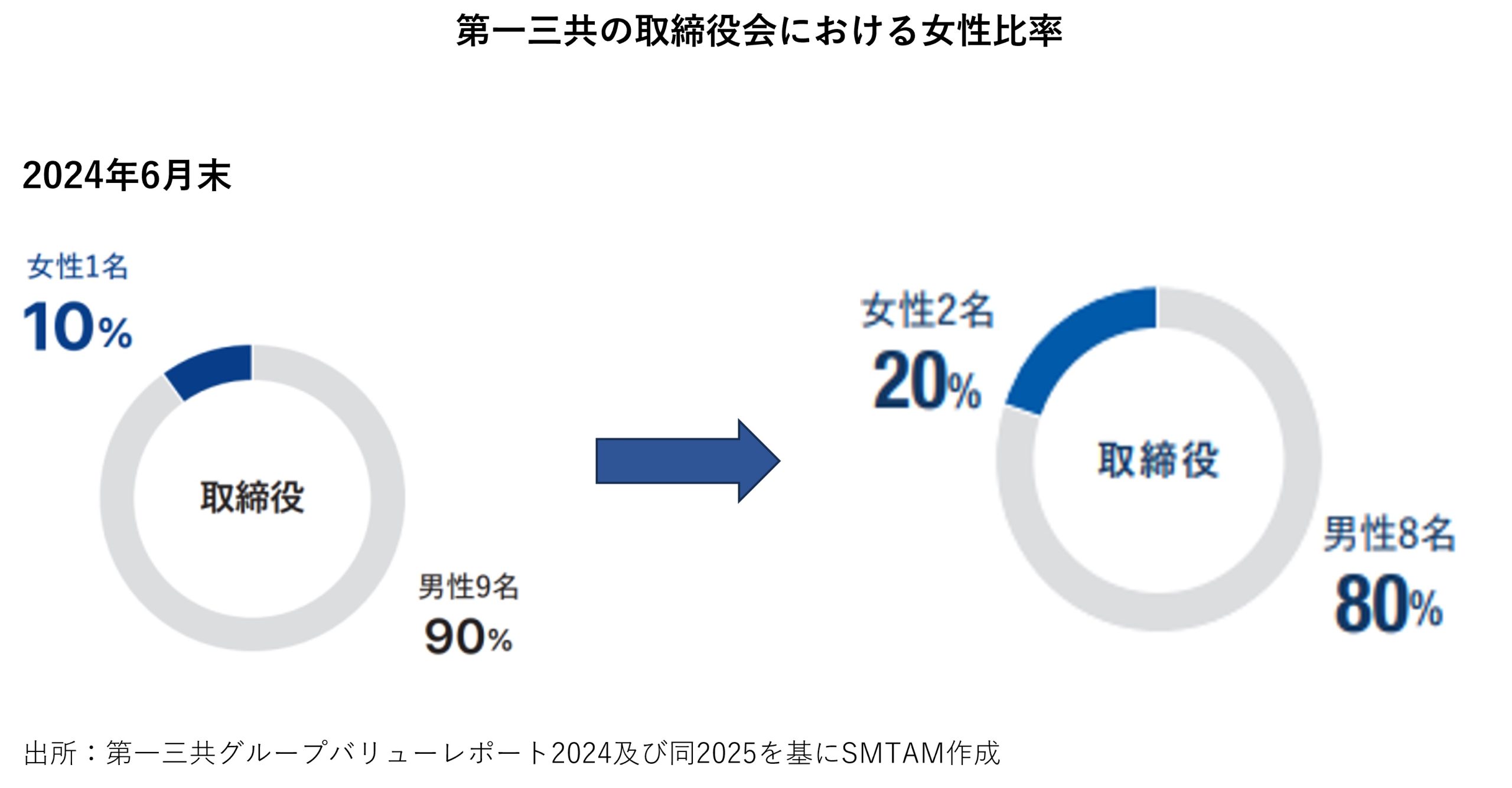 第一三共では2025年6月の株主総会で女性社外取締役に加えて、初めて社内から女性取締役が選任され、取締役会における女性取締役が複数名となりました。取締役会の女性比率向上において社外取締役を増員する企業が多いですが、第一三共の場合、グループ共通の価値観であるペイシェント・セントリシティ(患者さんを心の真ん中に)の特命担当がその実績と今後の役割の重要性を評価されて初の女性社内取締役に選ばれました。同時にがん治療事業をけん引する外国籍の社内取締役が選任され、ジェンダー視点を契機として複層的にダイバーシティの確保が進んでいることも重要な変化です。