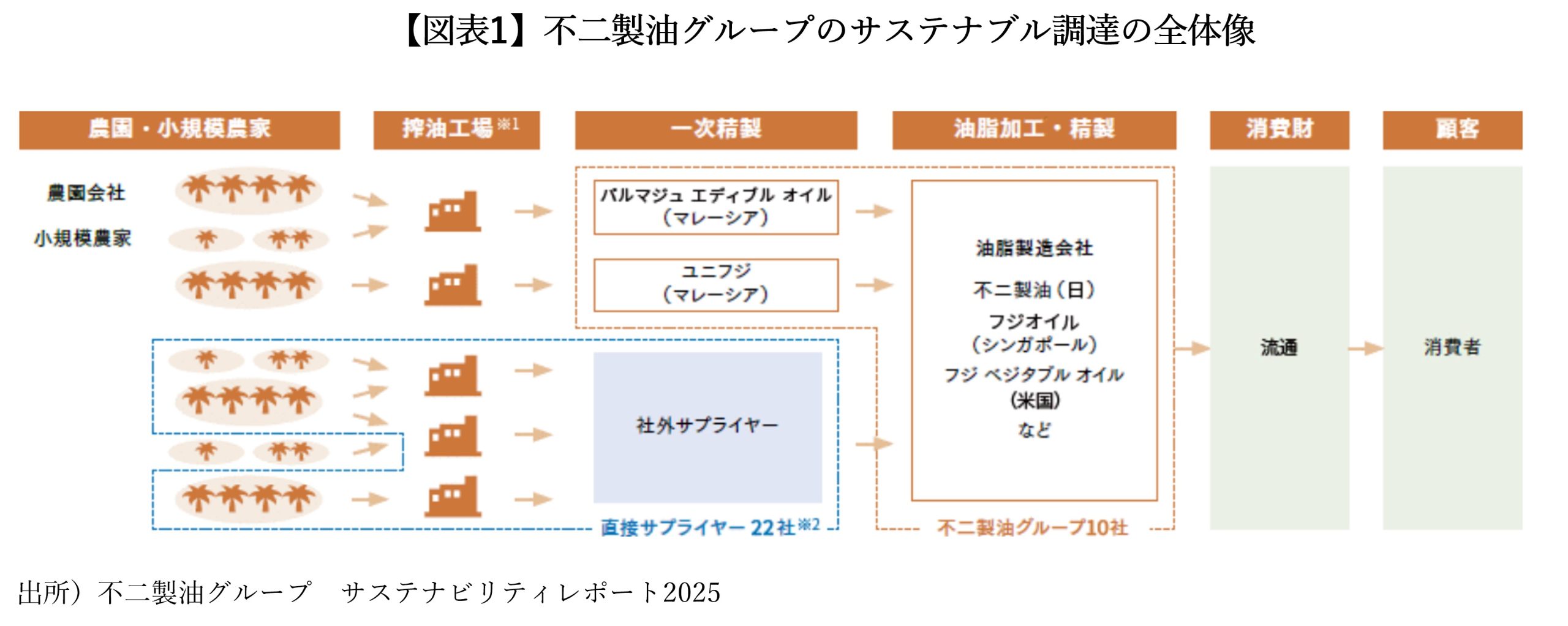 不二製油グループのサステナビリティレポートにも示されていますように、同調達方針は、自社グループ企業だけでなく、直接サプライヤー22社も含めたパーム油のサプライチェーン全体に適用されています(図表1)。「お客様や社会の困りごとに真摯に向き合う姿勢はまさに当社のDNAであり、その解決への貢献こそが持続的な収益の源泉と考えています」というCEOメッセージからもサステナブル調達実現の真摯さが伝わってきます。
