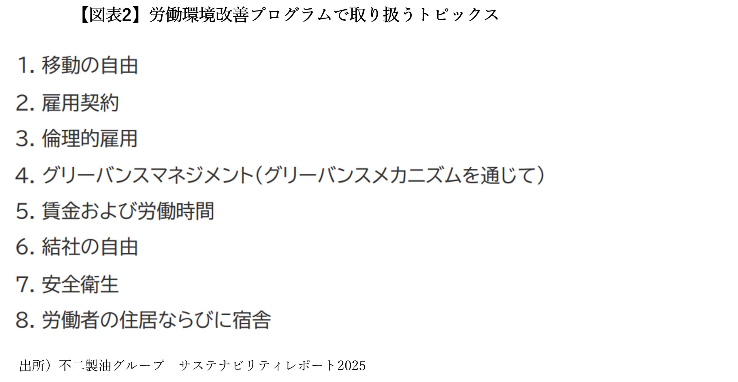 同社グループのトレーサビリティ強化の取り組みで特徴的な活動の一つが、サプライチェーン変革プログラムです(図表2)。労働環境改善プログラム(Labor Transformation Program: LTP)と呼ばれるそのプログラムは、強制労働や児童労働等のリスクを低減させることを目的に2017年からマレーシアの全サプライヤーに対し導入されています。本プログラムは通常現地の工場や農園の管理者と対面式で個別に実施されています。2025年3月時点で、サプライヤーの83%に本プログラムを適用しています。