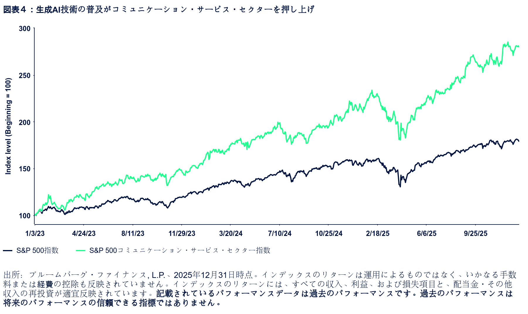 AIのイノベーションと導入を主導する大手コミュニケーション・サービス企業(Alphabet、Meta、Netflixなど)は、AI主導の事業効率改善(コンテンツ自動生成やスケーラブル・パーソナライゼーションから広告キャンペーンの最適化まで)から恩恵を受けています。その結果、同セクターの利益成長率は2023年から2025年にかけて3年連続で上位2位以内に入り 2、同セクターは同期間に市場全体を年率ベースで20%アウトパフォームし、最もパフォーマンスの高いセクターとなりました 3(図表4)。
