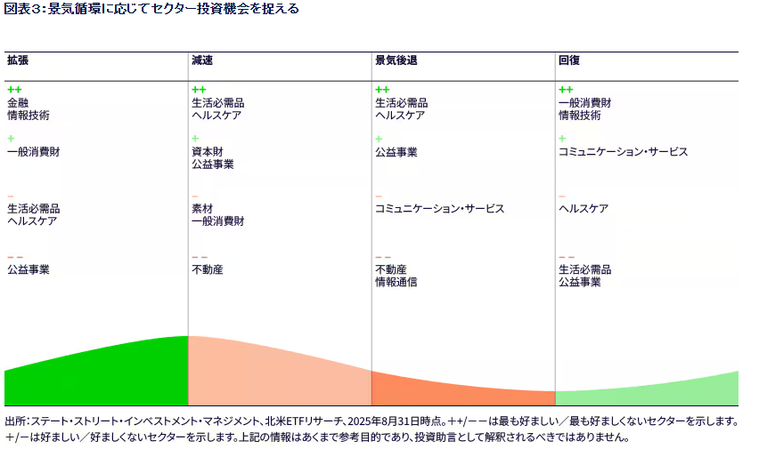 経済は循環的に変動します。通常、それぞれの局面ごとに異なる経済的特徴と、経済変数(金利、インフレ、個人消費、企業投資など)の変化がみられます。それらの変化は各セクターとその構成企業に異なる影響をもたらし得るため、様々な局面で特定のセクターがアウトパフォームまたはアンダーパフォームする可能性があります。