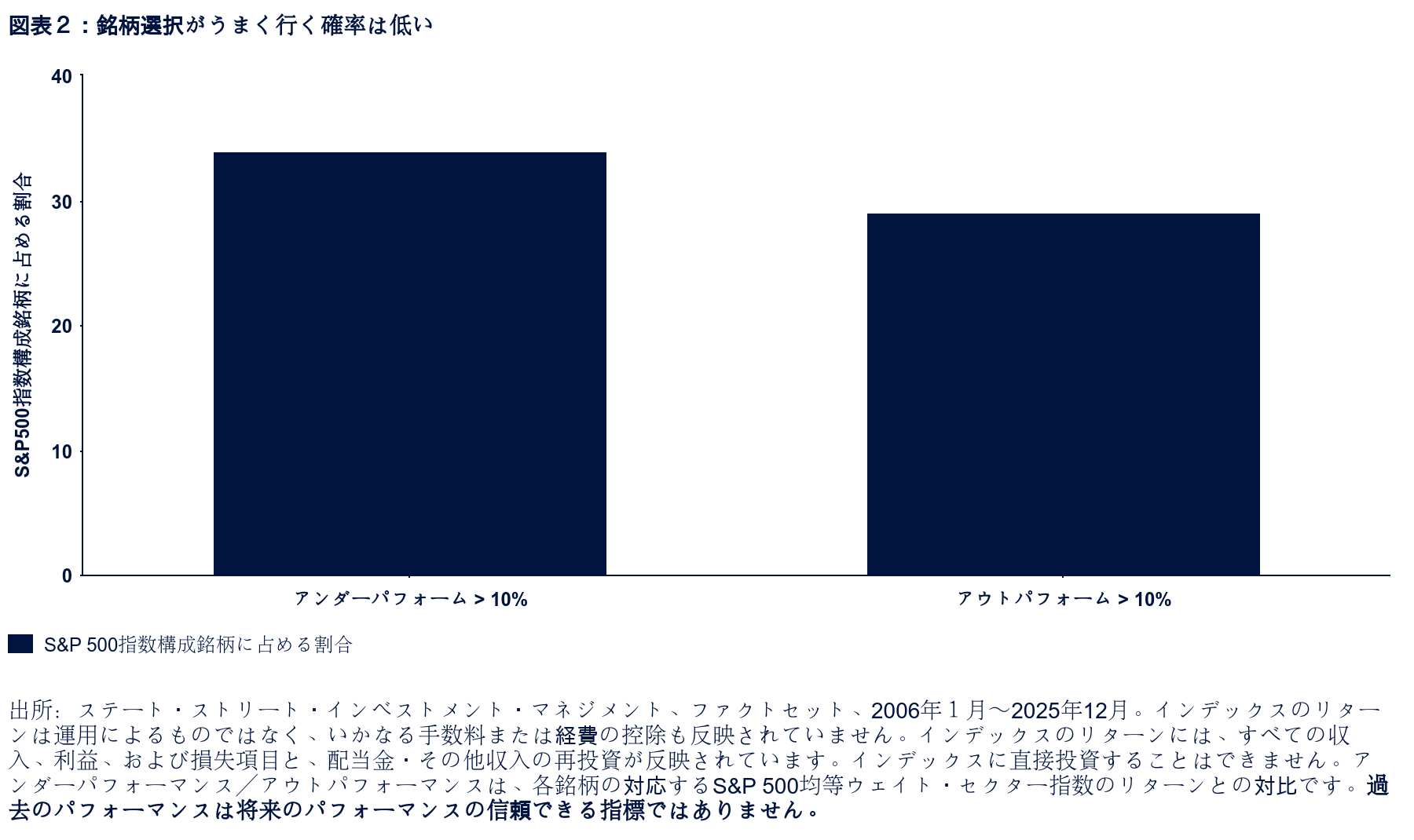 セクター・ベンチマークをアウトパフォームする銘柄を選び出すには、好調なパフォーマンスを上げているセクターに便乗しているだけの企業と、堅固なファンダメンタルズと優れた経営によってアウトパフォーマンスを実現している企業を区別する能力が必要です。しかし、運ではなく真のスキルを見極めるのは容易ではありません。過去20年間で、各セクター平均を10%超アンダーパフォームした銘柄の割合(34%)は、10%超アウトパフォームした銘柄(29%)を上回っています(図表2)。