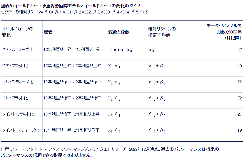 10年と2年の利回りの変化の方向性および相対的な変化幅に基づき、イールドカーブの変化を6つにカテゴリーに分類し、図表6に示したように、多重線形回帰分析でイールドカーブの各タイプを示すために5つのダミー変数X1 ~ X5 (0または1)を作成しました。