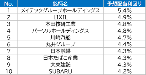 組入銘柄のうち、予想配当利回りが高い上位10銘柄