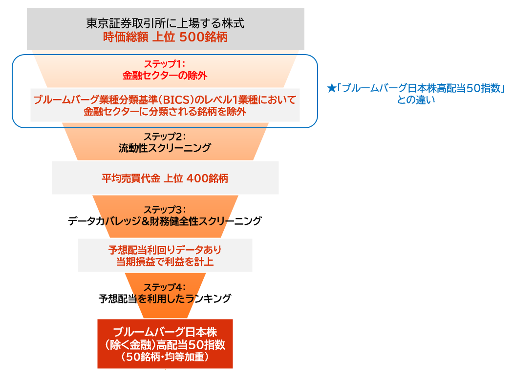 | 対象指標の概要 | ブルームバーグ日本株(除く金融)高配当50指数は、ブルームバーグが定める日本の大型株、中型株、小型株のうち、財務健全性を保ちつつ予想配当利回りの高い50銘柄で構成された株価指数です。時価総額、セクター(※)および流動性に配慮し銘柄選定され、四半期ごとに銘柄入替を行ない、等ウェイトとなるようにリバランスを行ないます。2015年4月15日を起算日(1,000ポイント)とし、指数値の算出と公表は日次で行なわれます。 ※ブルームバーグ業種分類基準(BICS)のレベル1業種において金融セクターに分類される銘柄を除外しています。 |