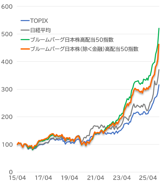 一方で、機関投資家の中には、ダブルギアリング規制の観点から金融セクターへの投資比率を抑える投資ニーズが確認されています。また、足元では不透明な世界情勢の中で、日銀は利上げに前向きな姿勢を続けていますが、今後、市場が利上げ局面の終盤を意識するようになると、金融株の値動きに対する警戒感が高まる可能性もあります。そこで、今回新たに「(銘柄コード:566A)iFreeETF ブルームバーグ日本株(除く金融)高配当50指数」を組成いたしました。投資家の皆様の見通しや運用方針に応じて、当社の日本株高配当ETFを使い分けてご活用いただければ幸いです。
