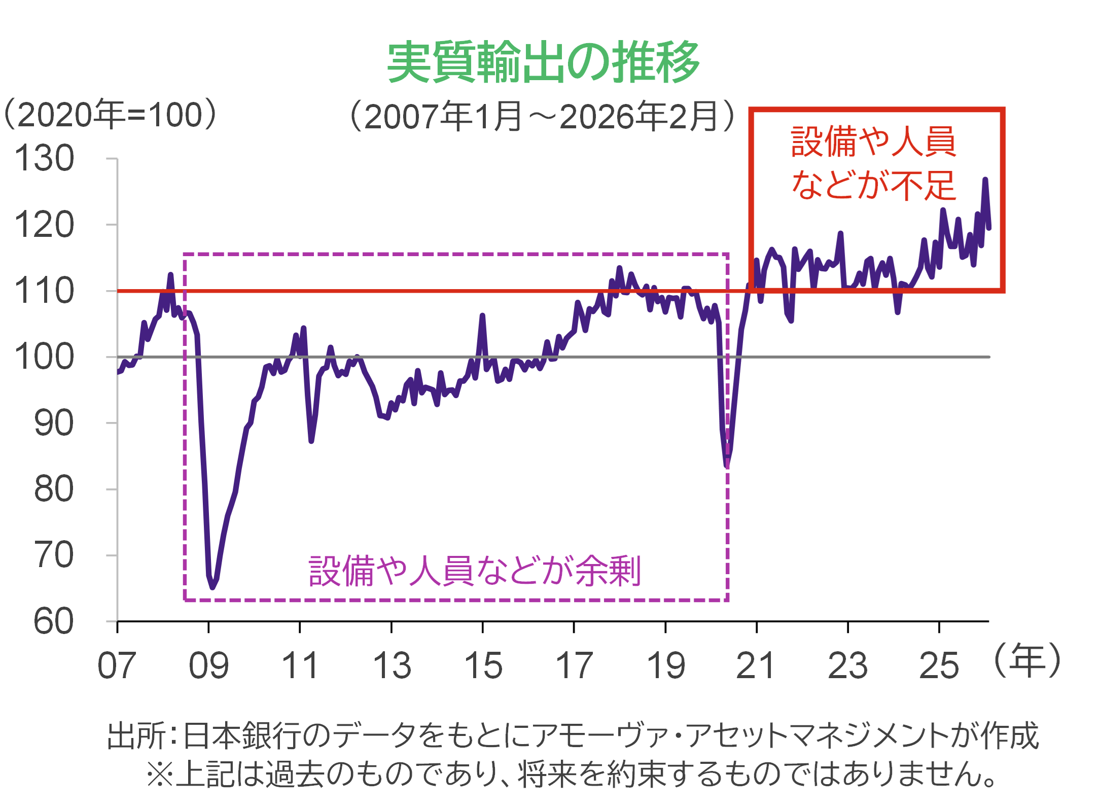 日本を買う理由1は、日本経済が「余剰」から「不足」へと転換する局面にある点(KAMIYAMA Reports Vol. 241、2024年2月、以下Vol.番号で示す)である。人手不足から賃金が上昇し、企業も設備投資を積極的に増やし始め、好循環が始まったことである。実質輸出指数を見ると、リーマン・ショック直前の110台には届かない状態(100程度)が約10年続いた。