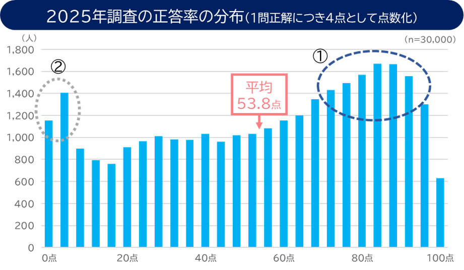 2025年調査を見ると、81点以上の高い金融リテラシー層が少し増えたのは、前向きな変化と言えます。その一方で、0~20点の層の割合が大きく増えており、また、平均点付近に位置する中間層(41~80点)が減少していることが目立ちます。