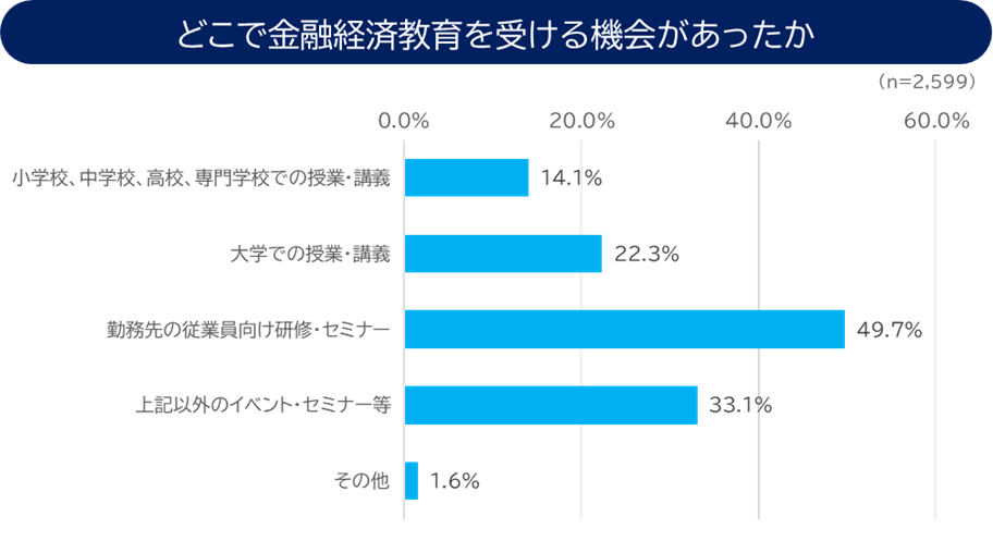 なお、受けたことがあると回答した8.7%の人に、どこで教育を受けたかを尋ねると、「職場」、「イベント・セミナー」、「大学」などが多く挙げられています。(【図表1】)