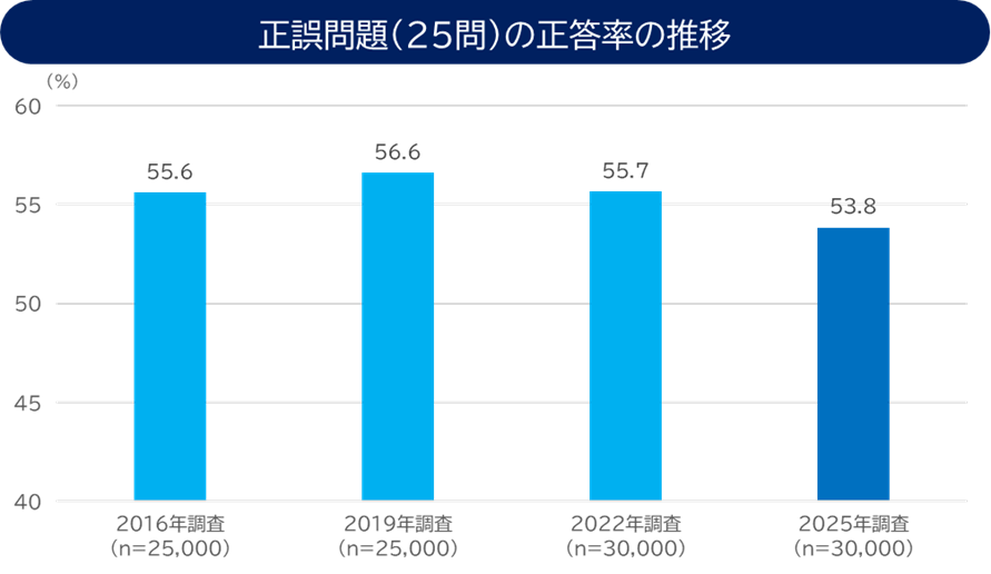 ただし、過去の調査結果と比較すると、2025年調査の正答率は、これまでで最も低い水準となりました。前回(2022年)調査と比べて、1.9%ポイント低下しています。(【図表3】)