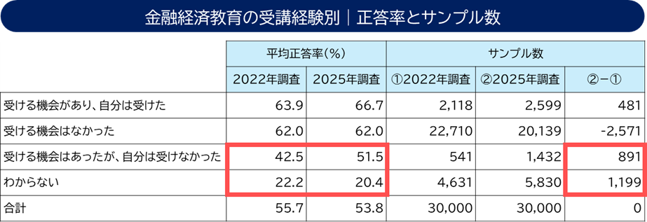 ※ちなみに、受講経験を質問する設問は、2022年調査までは「金融教育」という表現が使われていましたが、2025年調査では「金融経済教育」へと変更されています。説明や注釈はあるものの、この言葉の変化が、さらに回答者をわからなくさせた可能性もあります。