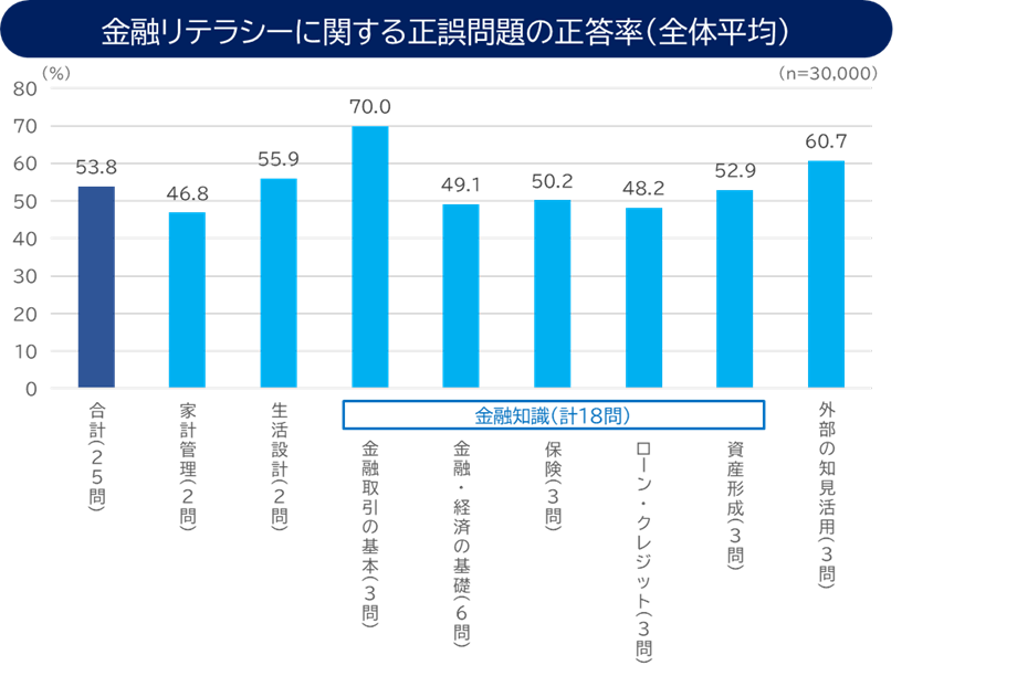 金融リテラシー調査の中で、特に注目されるデータが、25問からなるお金に関する正誤問題の正答率です。
