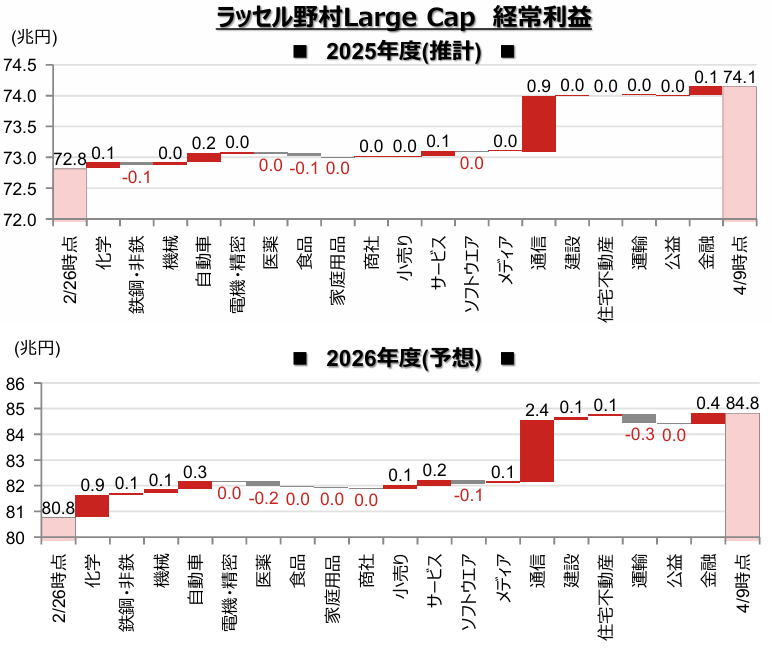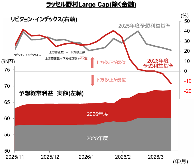 2026年4月下旬より、3月決算企業の2025年度実績の発表が本格化します。2026年4月13日時点で、ラッセル野村Large Cap(除く金融)では、前年度比5.9%経常増益が見込まれています。一方、会社側の見通しでは同1.2%増益となっています。