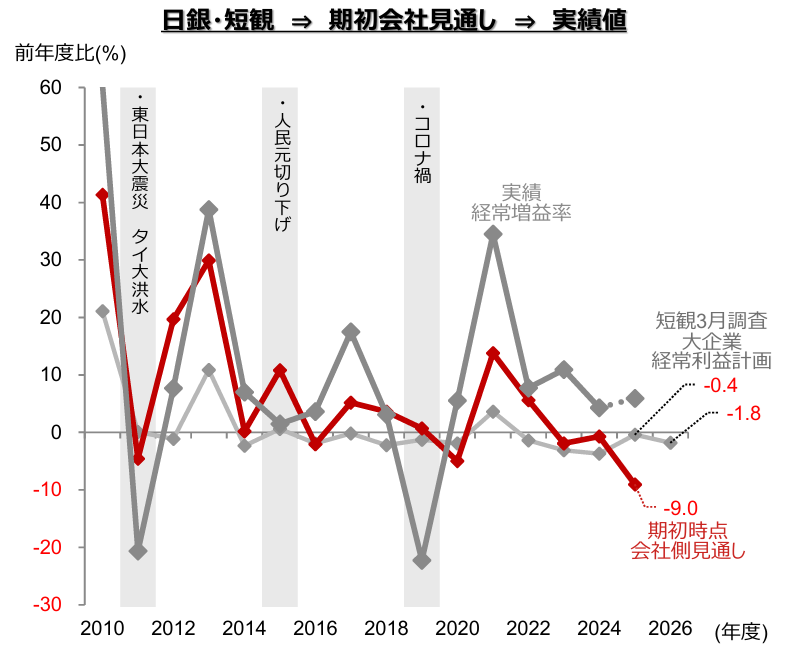 (注2)細い灰色線は各年の日銀短観3月調査・大企業・経常利益計画。直近値は2026年度。