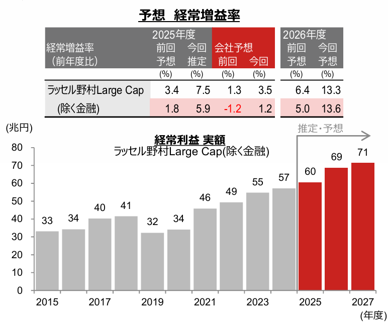 (注2)下図は、ラッセル野村Large Cap(除く金融)の経常利益実額。2025年度以降は野村證券市場戦略リサーチ部による推定・予想。2025年度以前は、各年度の経常増益率(前年度比)実績をもとに遡及して計算している。