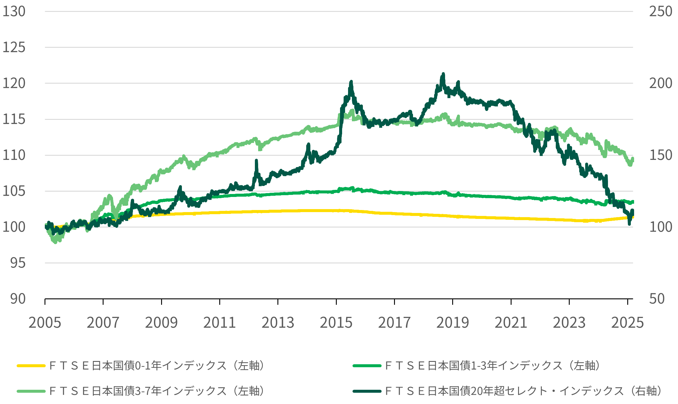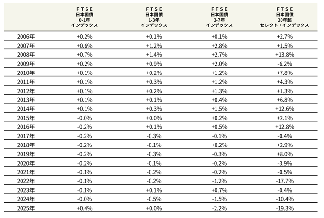 | 対象指標の概要 | (1) FTSE日本国債0-1年インデックスは日本国債の残存期間が1年未満の各銘柄を時価総額にて加重平均した債券インデックスです。 (2) FTSE日本国債1-3年インデックスは日本国債の残存期間が1年以上3年未満の各銘柄を時価総額にて加重平均した債券インデックスです。 (3) FTSE日本国債3-7年インデックスは日本国債の残存期間が3年以上7年未満の各銘柄を時価総額にて加重平均した債券インデックスです。 ⑷FTSE日本国債20年超セレクト・インデックスは日本国債の残存期間が20年超の銘柄から20年債指標銘柄(オン・ザ・ラン銘柄)を除外し、各銘柄を時価総額にて加重平均した債券インデックスです。 |