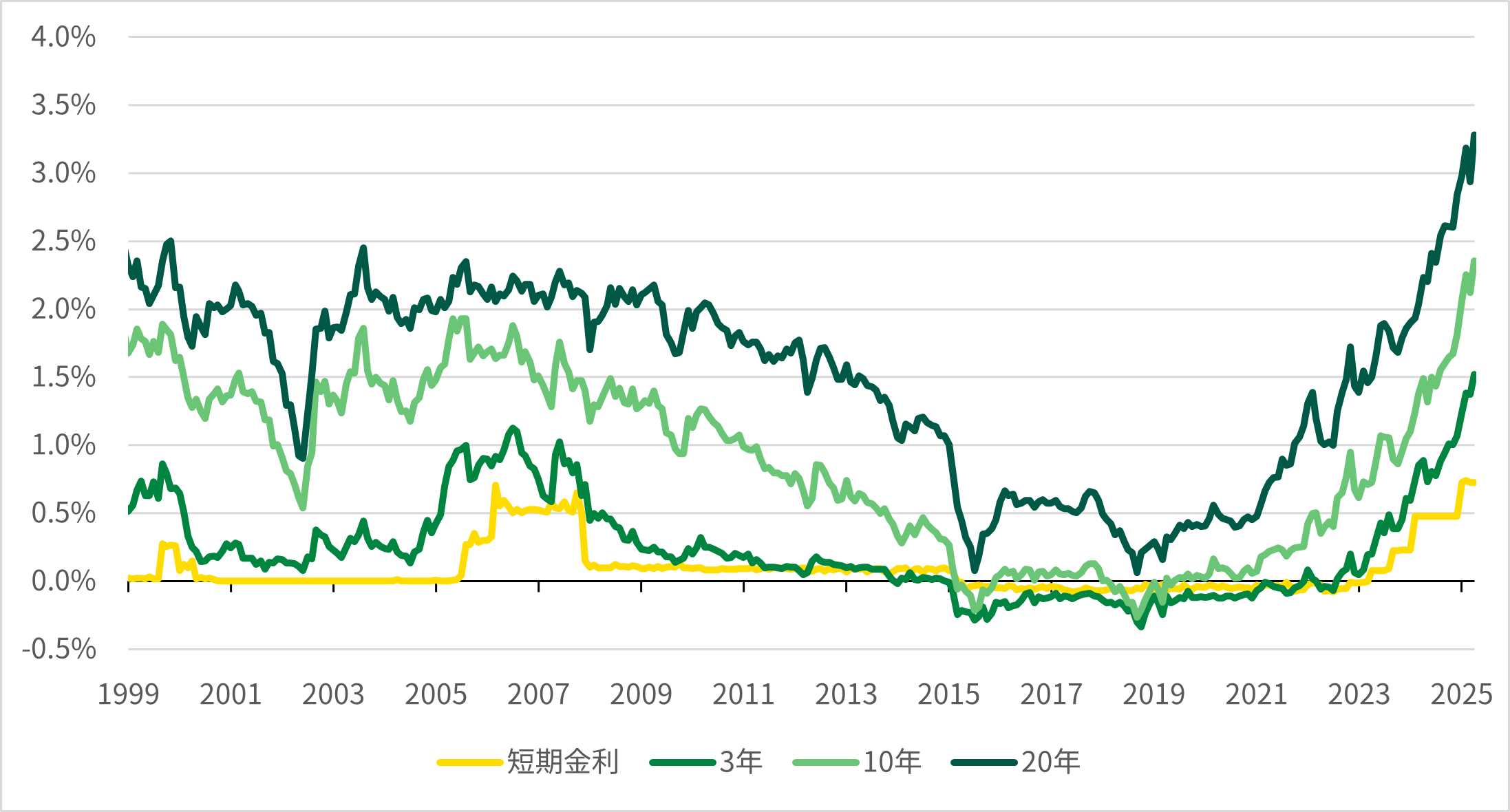 日本の債券市場は、長い間強力な金融政策の下、短期から超長期まで、様々な年限の金利が低く抑えられていました。しかし足元では、日銀の金融政策が正常化する中で、年限ごとの金利は、徐々に市場メカニズムに基づいて変動するようになっています。