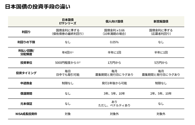日本国債への投資には様々な手段がありますが、本ETFは他の代表的な投資手段と比較しても、投資タイミングや流動性、利回りの観点で特徴があります。