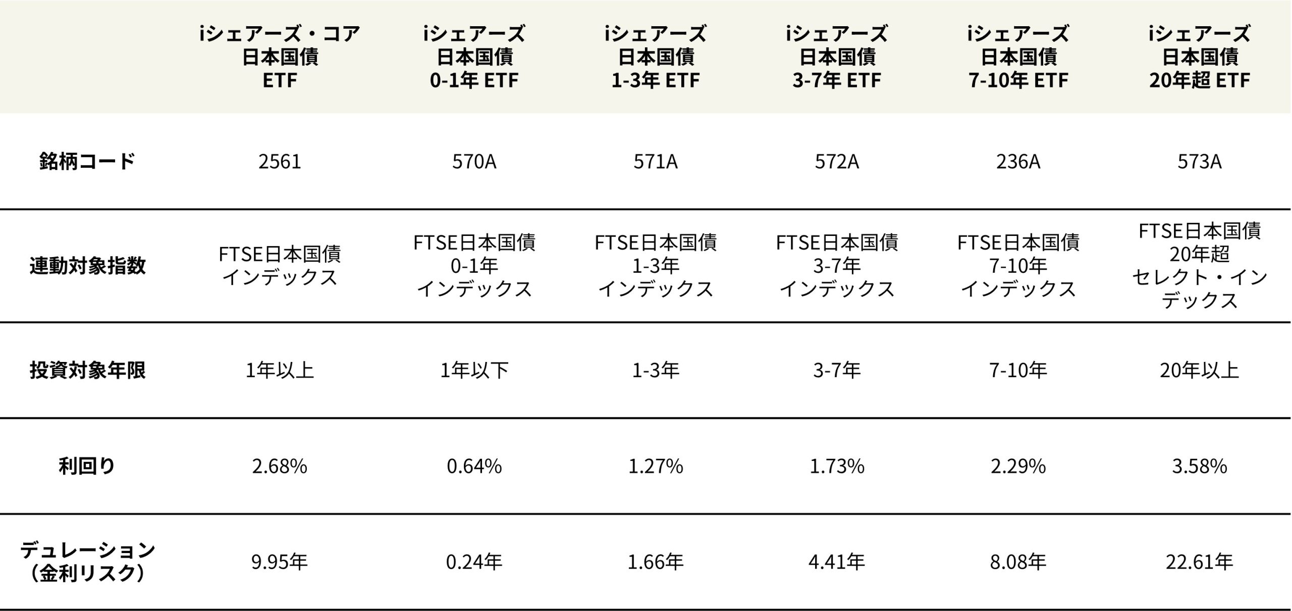 本ETFは、短期から長期までの年限ごとに分かれており、それぞれ異なる役割を持っています。