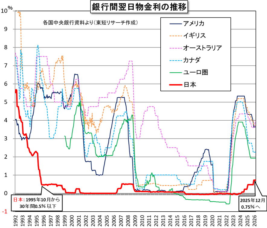 日本においては日本銀行による「金融政策決定会合」という決定機関が変更・決定を実施しており、現行では短期金利(無担保コール翌日物金利)が政策金利として定められている。2026年4月現在、日本銀行が決定している政策金利は0.75%となっており、主要先進国の中では圧倒的に低い水準となっている。