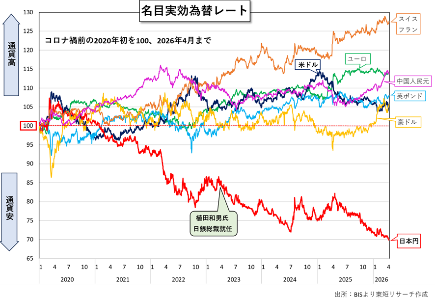 さらに深刻化しているのは円安の長期化である。購買力平価で比較すると、ビッグマックはアメリカでは約5ドル、日本では約500円であり、理論上の為替レートは1ドル=100円となる。現在の市場レートは1ドル=160円前後で、購買力平価に比べて円は大幅に割安(円安)になっている。他国でも同様ないしはそれ以上に割安化しており、円は相対的に「価値に乏しい」通貨として位置づけられてしまっている。